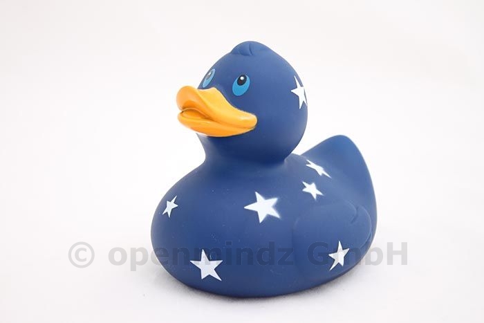 Stanislaus Stern ist ein großes Quietschentchen mit ganz vielen Sternen bedruckt.