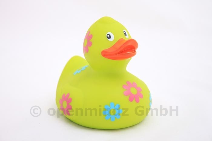 Diese mit bunten Blumen bedruckte Flower Power Quietscheente bringt die 70er in Ihre Werbung!