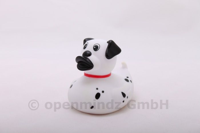 Daniela Dalmatente ist eine süße Quietscheente im Dalmatinerlook. Daniela lässt sich an unterschiedlichen Stellen bedrucken. Exklusive Hunde-Badeenten setzen wir gerne ab 3000 Stück individuell für Sie um.