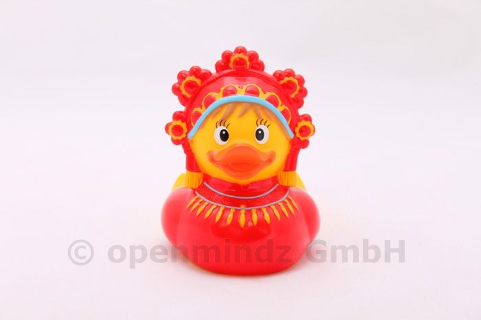 Galina GUS ist unsere russische Badeente in traditioneller roter Tracht. Detailreich und farbenfroh sticht sie aus der Masse an Quietscheenten heraus und wird auch Sie überzeugen. Übrigens gibt es sie auch als Paar zusammen mit Ihrem Partner Mikhail Moskau.